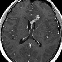 ガドリニウム増強では,前頭葉腫瘍というより,側脳室壁にベトベトくっついているような腫瘍です。germinoma特有のsubependymal infiltration像を示します。