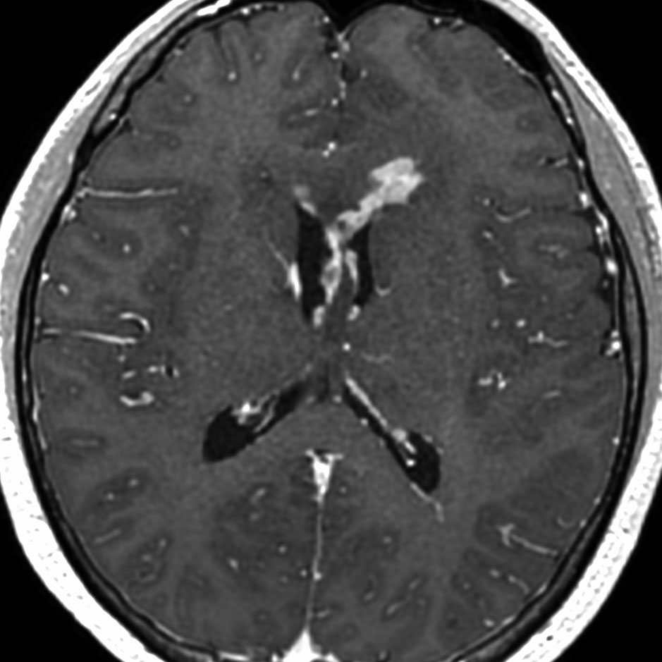 ジャーミノーマには好発部位というものがあります,神経下垂体,松果体,大脳基底核などですが,例外的な発生部位もあるので注意です。この例は,浸潤形態が脳室壁に沿う subependymal infiltrationという特徴からジャーミノーマと画像診断できるものです。