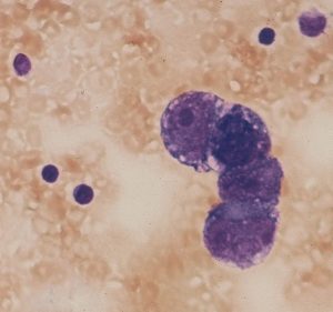 これは1994年の脳室液細胞診で,大型の核小体を有する腫瘍細胞があります