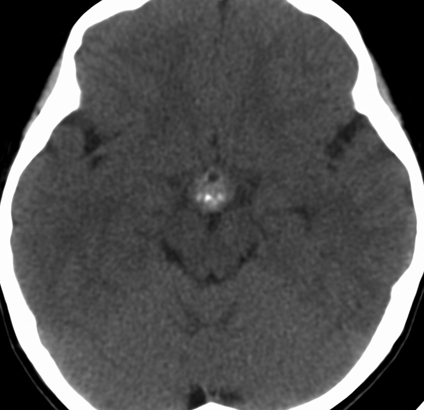 10歳くらいから身長の伸びが遅くなって,12歳で食欲低下と体重減少がありました。左のMRIはガドリニウム造影MRIで,視床下部と下垂体を侵す神経下垂体ジャーミノーマです。CTでは小さな石灰化(白い点)がみえます。CT検査は不必要なものでした。