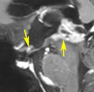 松果体と神経下垂体の両方に腫瘍が同時に発生するものをbifocal tumorsと呼びます,あるいはsynchronous tumorsとも言います。従来から頭蓋内胚細胞腫瘍特有の画像所見と言われて来ました。この2箇所発生の腫瘍が,尿崩症で発症して腫瘍マーカーもはっきり上昇していない場合,全てgerminomaと言ってよいかどうかが検討されました。132例があてはまり,その内の91例で組織採取がされました。逆に,41例 (31%)では組織採取なしに治療がされたことになります。89例で組織診断がなされ,82例 (92%)がgerminomaでした。成熟奇形腫が2例と炎症が2例認められています。3例でgerminoma以外の胚細胞腫瘍の診断がついています。炎症というのはgranulomatous inflammationであり,CTや血管造影検査をした後でgerminomaを生検した場合によく認められる組織所見です。