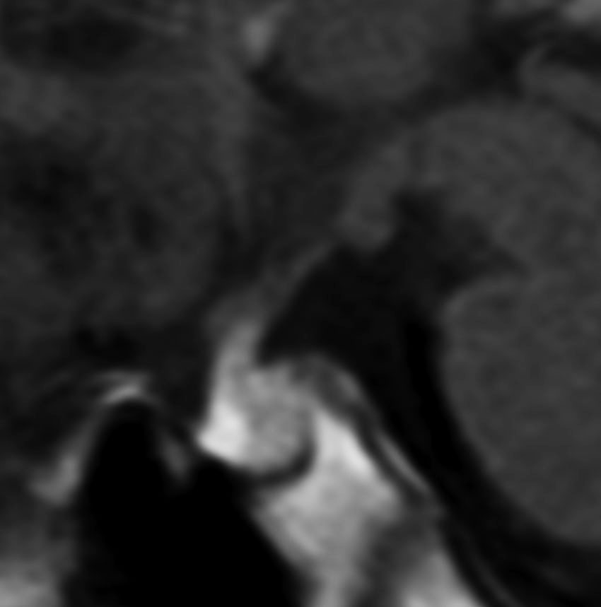 非常に典型的な下垂体後葉germinomaの画像です。萎縮して残った前葉線組織が前方にありガドリニウム増強されます。薄く増強されているトルコ鞍背部がgerminomaです。経蝶形骨洞手術で下垂体底面をもちあげて生検を行いました。