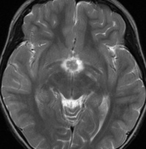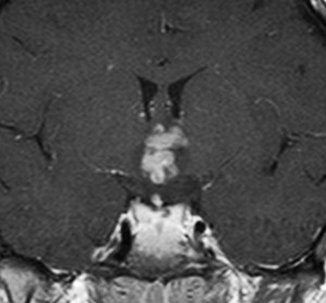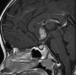 血清HCG-beta 4.5mIUで,下のMRIに見られるように第3脳室(視床下部)のグリオーマ(毛様細胞性星細胞腫)と見間違うような腫瘍でした。下垂体柄は太くなっていないし下垂体のサイズも普通です。もちろん水頭症もありませんので,開頭手術で生検をしてgerminomaの診断を得ました。