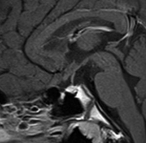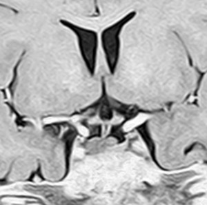 6年以上発ちますが再発はありません。右の画像のように視神経交叉のサイズは正常化しました。下垂体は左に偏っているので,おそらく右側の下垂体にも腫瘍があったのでしょう。汎下垂体機能低下症はありますが,副腎皮質ホルモンの補充は必要なくて,部分的下垂体機能低下症です。この幼児期の低身長が視床下部性であったのか,下垂体前葉機能低下によるものであったのかは不明です。治療後に高ナトリウム血症になる傾向があり,思春期早発症のために成長ホルモンを使用しながらLH-RHアナログを使うという事もしていますから,おそらく視床下部性のGHDであったのでしょう。