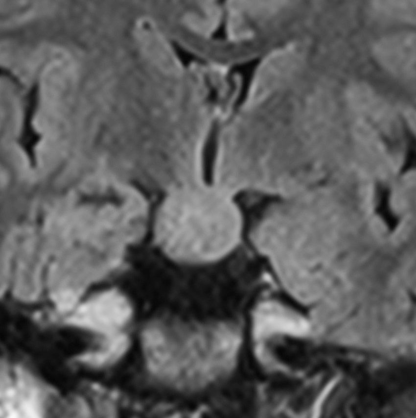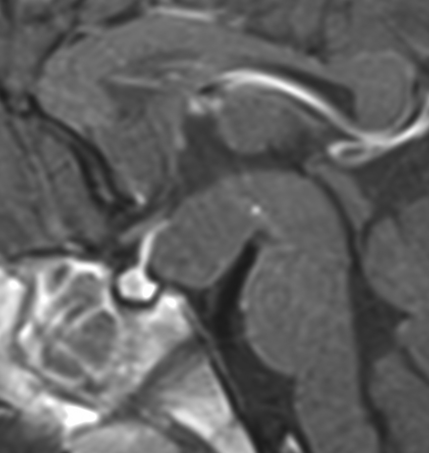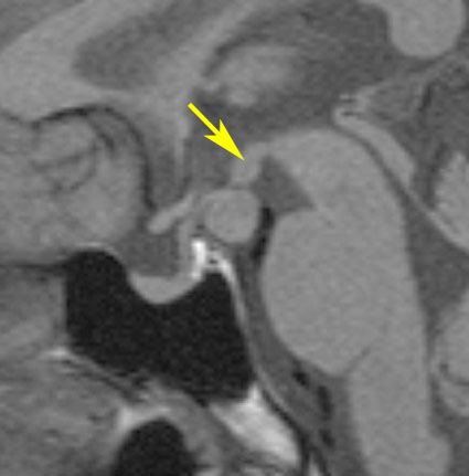 • 下垂体柄の付け根,乳頭体の前で,視床下部から下方(脚間槽)に突出する塊 massです