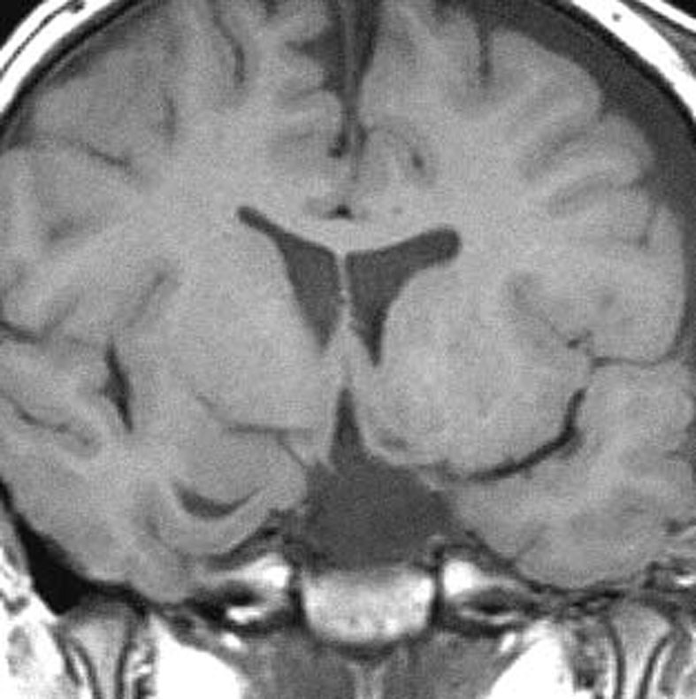 おそらく左視床下部の機能低下と難治性の発作が原因で,左大脳半球の萎縮(あるいは発達不良)が認められます