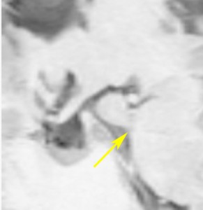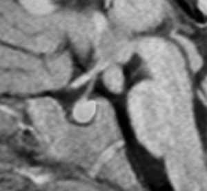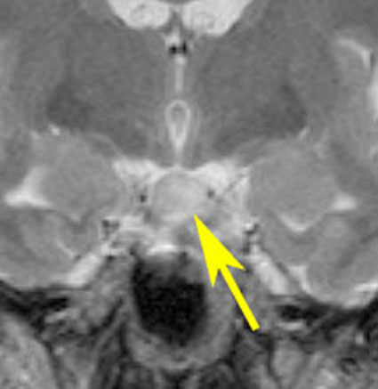 無症候で発見されたpedunculated typeです。視床下部の底面からぶら下がるようにしてあります。左のCISS画像で形がよくわかります。中央のT1では灰白質と等信号です。右のT2では高信号となっています。