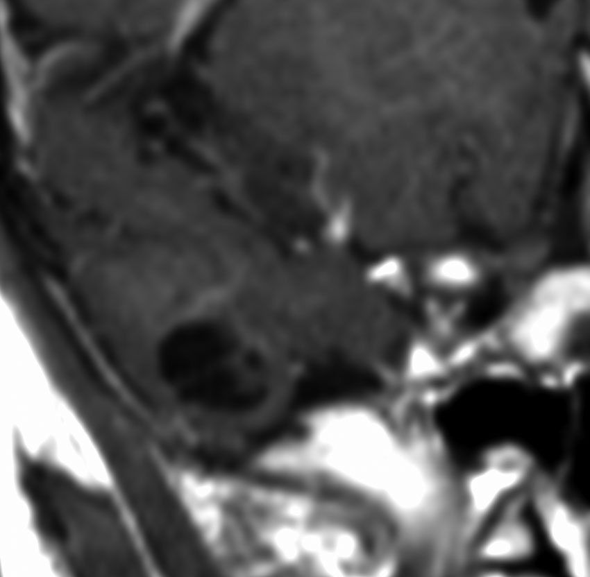 - 画像では,T2強調画像でまだらな高信号 salt and pepper sign,ガドリニウムで部分的に増強され,境界が不明瞭で染み込むように広がっています