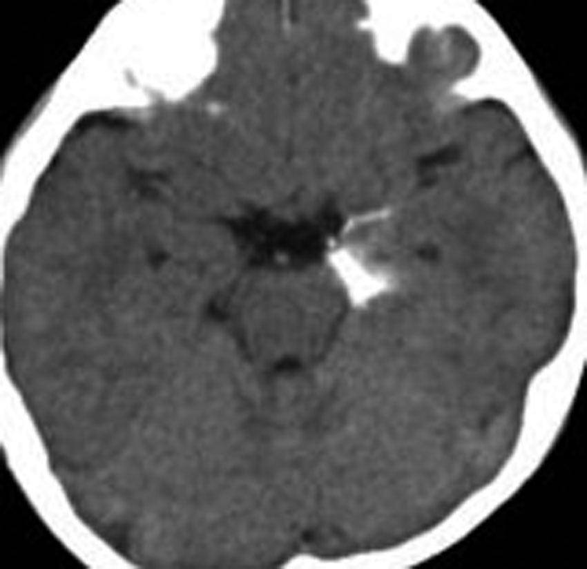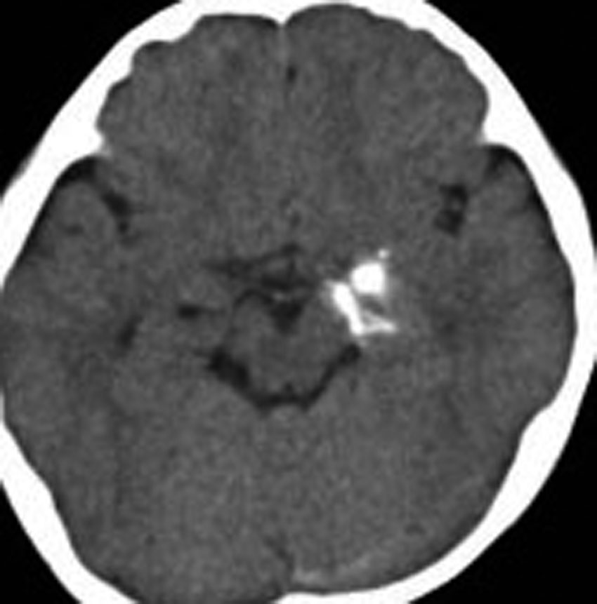 乳児期に全身性感帯痙攣発作で発症しました。左海馬鈎に強い石灰化があります。側頭葉硬化症とも言われるものです。この部位の過誤腫様の腫瘍は難治性てんかんとなることが多く,病変切除が必要となります。