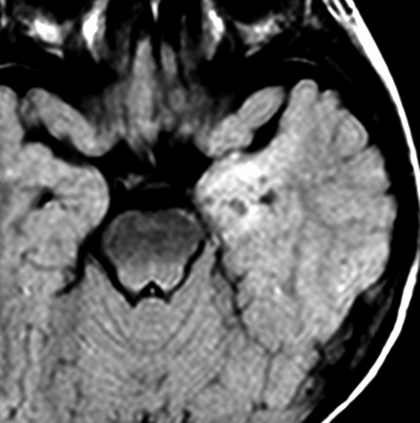 右側頭葉先端の腫瘍です。発症時にはMRIで異常所見がありませんでしたが,徐々に顕在化しました。ガドリニウム増強はなく一部のう胞性です。