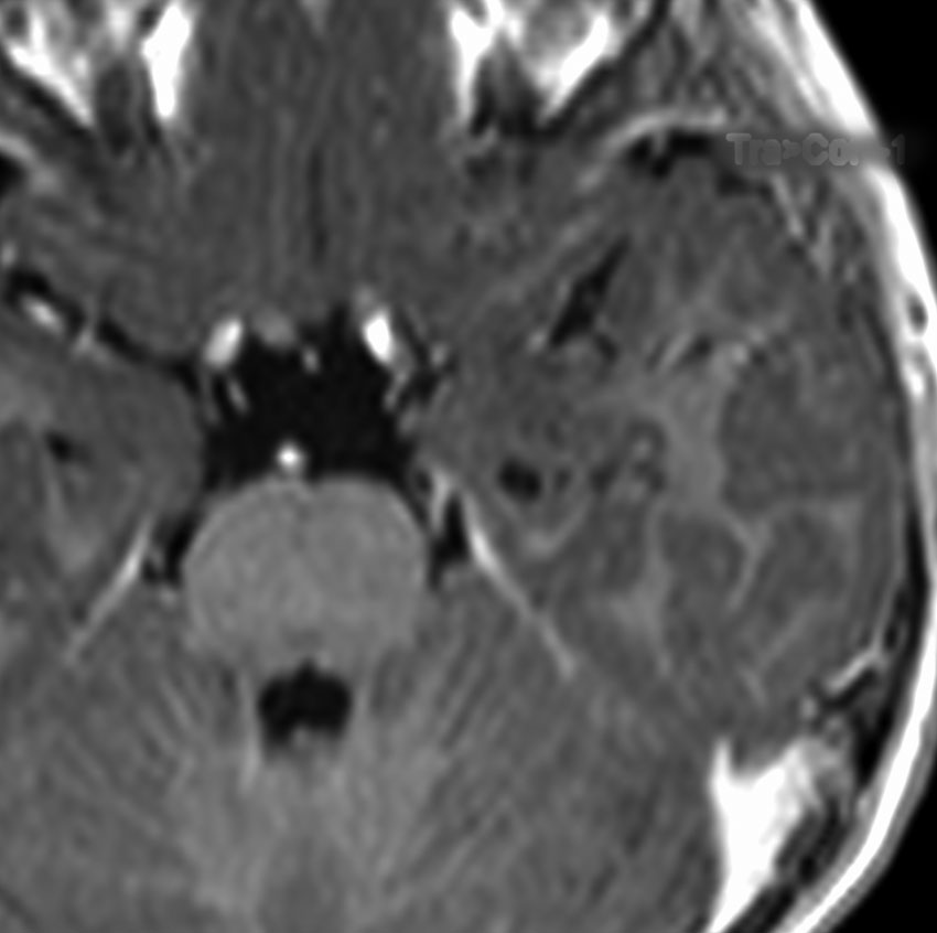 MRIでは橋の背側(第4脳室床)にT1/T2で等信号の隆起(腫瘤)がみられました。