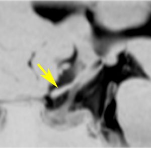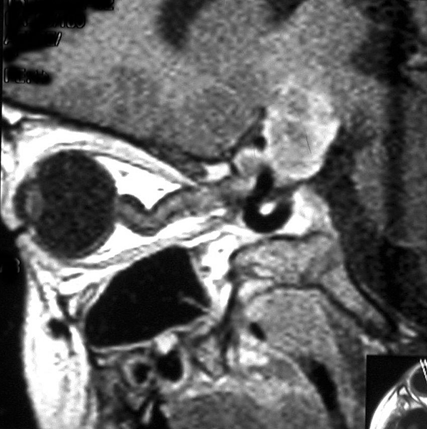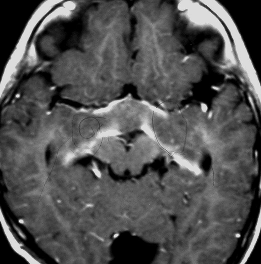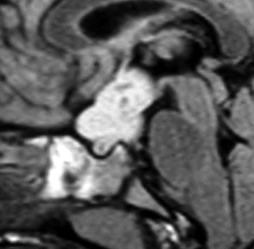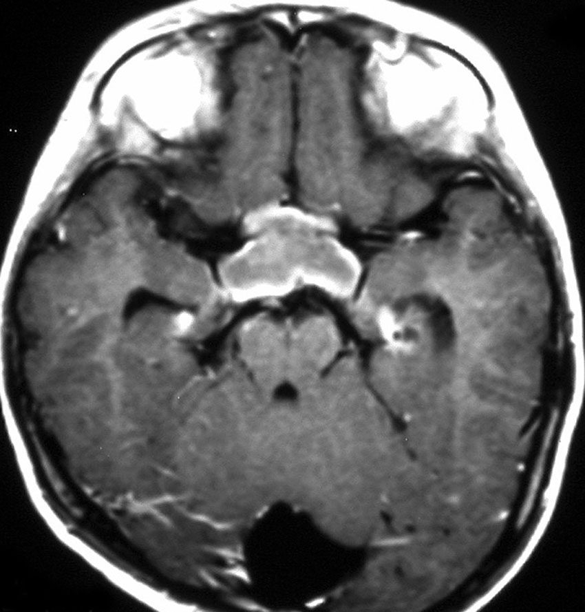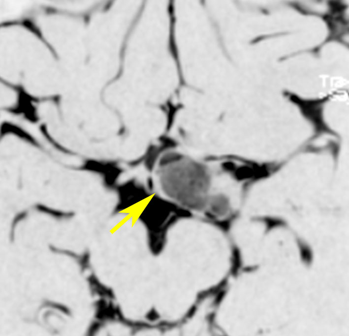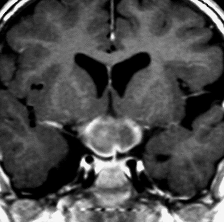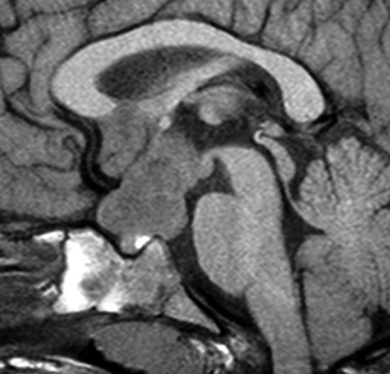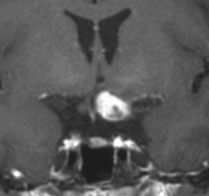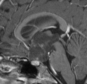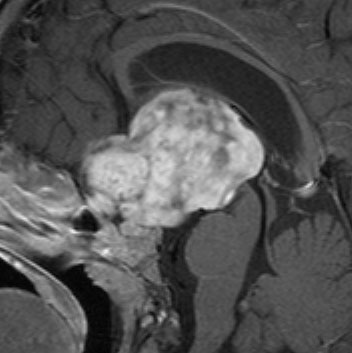 成人では,増大しないmassとして腫瘍が発見されます。T2強調画像でわずかな高信号,ガドリニウムでほとんど増強されない,無治療で経過観察しても全く変化がないということがしばしばであるので,視野欠損などの症状があっても,このようなものを疑えば生検手術もせずに経過のみをみたほうがいいです。