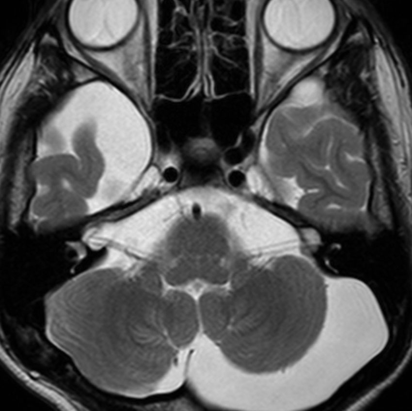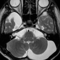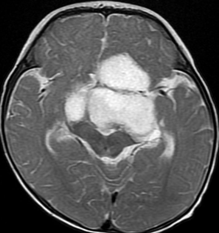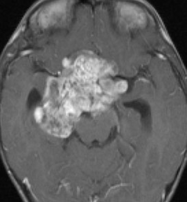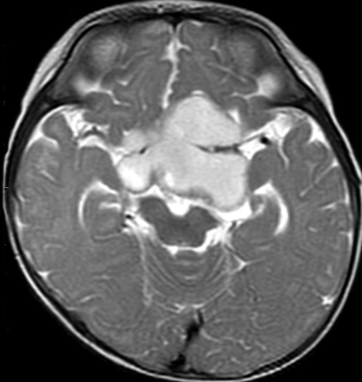幼児の視路の毛様粘液性星細胞腫です。T2強調画像(左側)で白く高信号に写るのが特徴です。ガドリニウム増強ではまだらになっていますが,均一に真っ白に高信号になることも多いです。乳幼児のものは,ドロドロに柔らかい腫瘍です。