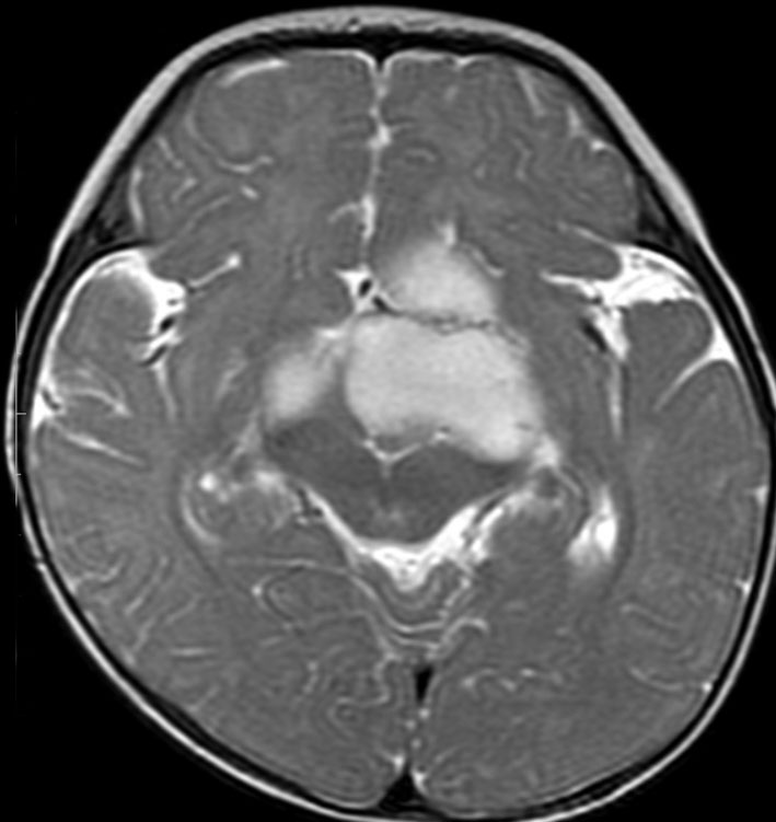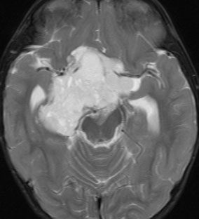 乳幼児時期には,病理組織像が毛様粘液性星細胞腫で,MRI T2で均一な高信号になりガドリニウムで強く増強されます。腫瘍の増大速度は速く,稀には髄液播種することもありそれが腫瘍死の原因となることもあります。奏効率の高い化学療法を早く開始する必要があります。