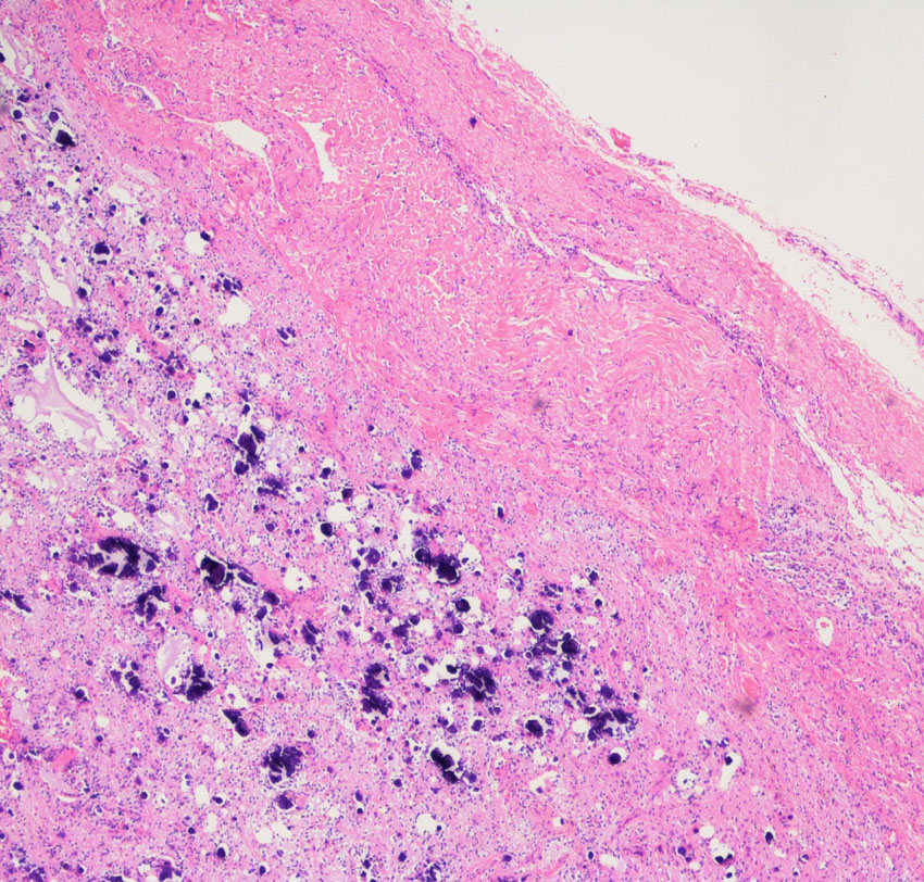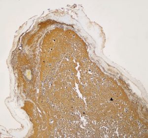 厚く肥厚した視神経鞘の内部の視神経組織はほとんど腫瘍に置き換わっていて,GFAPで染色され高度の石灰化を伴います。これは腫瘍というよりも瘢痕化してしまった,adult-type pilocytic astrocytomaに認められる所見です。