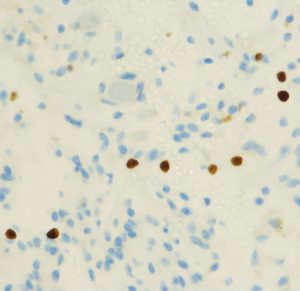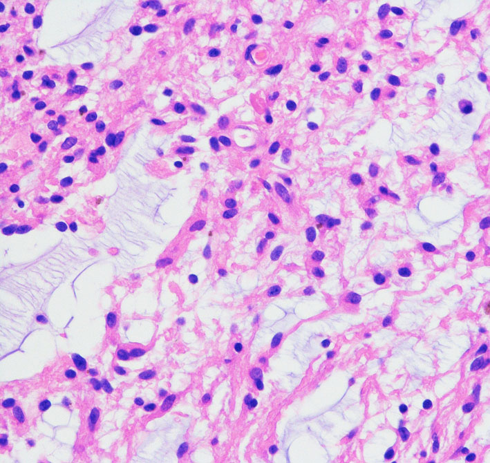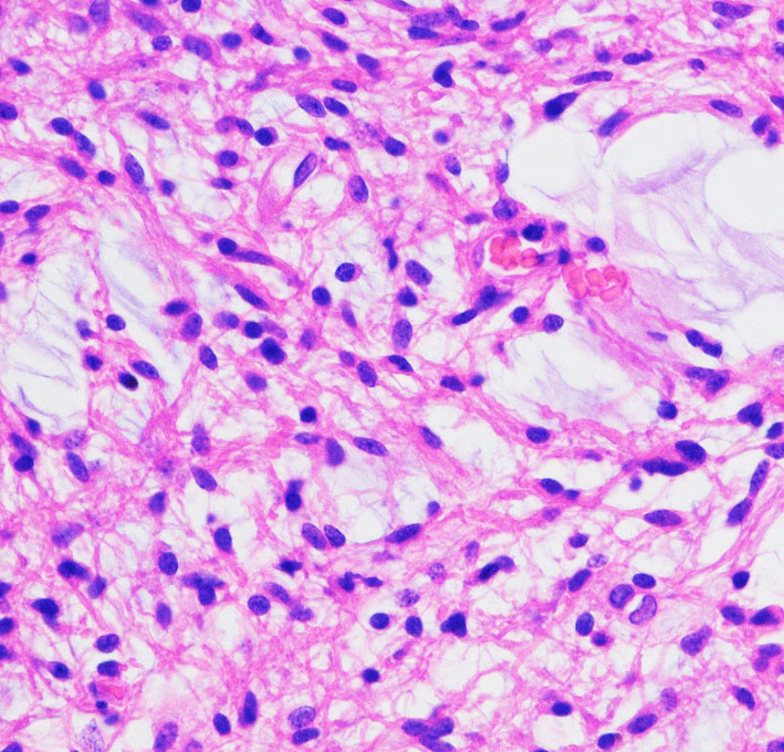 myxoidな部分です。右下のMIB-1染色では3%ほどの陽性率であり,数年単位では腫瘍増大があり得ることを示します。柔らかく出血性で吸引摘出できる部分の腫瘍です。IDH wild type, BRAFV600 wild type, H3K27 wild type, FGFR1 N546K mutationでした。