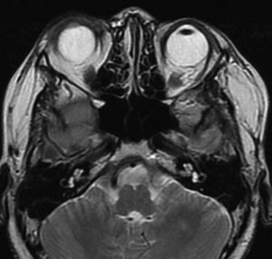 左が16歳,右が23歳の時のMRI画像です。太く見えた視神経が,大きな塊となりました。ガドリニウム増強で,腫瘍の内部が部分的に増強されます。眼球が突出して目を閉じることができず,むき出しになりました。8歳から23歳まで,15年間かかってゆっくり大きくなったし眼窩内神経膠腫です。