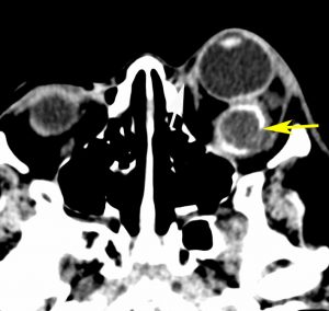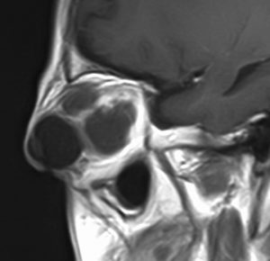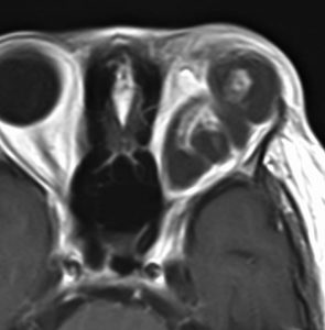 3度目の左前頭開頭手術となりましたが,無事に眼窩内腫瘍は摘出できて,眼球は温存できました。眼球後極での視神経切断がもっとも難しく,毛様体神経や眼球の栄養動脈などを温存しないと,すぐに眼球萎縮になってしまいます。