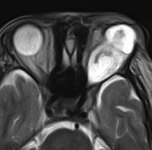 CTでは高度の眼球突出があり,腫瘍の辺縁が石灰化していて視神経鞘を含めて極めて硬い線維性腫瘍となっていることがわかります。T2強調画像では高信号で腫瘍が増大傾向を示し,一部が嚢胞性であることがわかります。下のT1増強像では腫瘍の中心部分に増強される増殖部位があることがわかります。