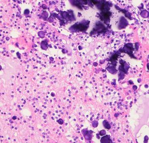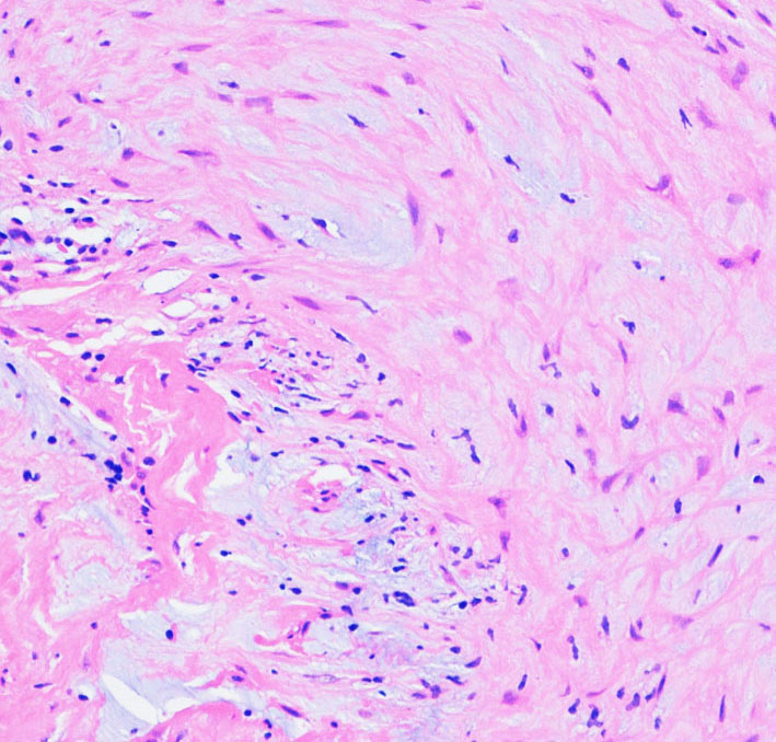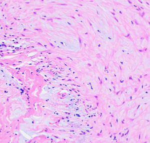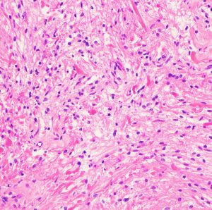 Rosenthal fiber, eosinophyric granular body, psammoma bodyなどが認められ,成熟しきって退行変性に移行するpilocytic astrocytomaの像です。この部分は増大しません。線維性に極めて硬い組織です。