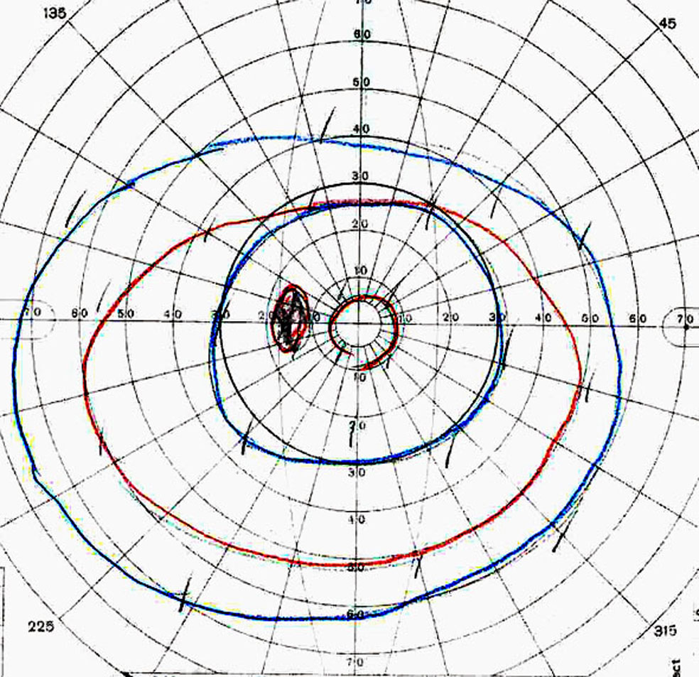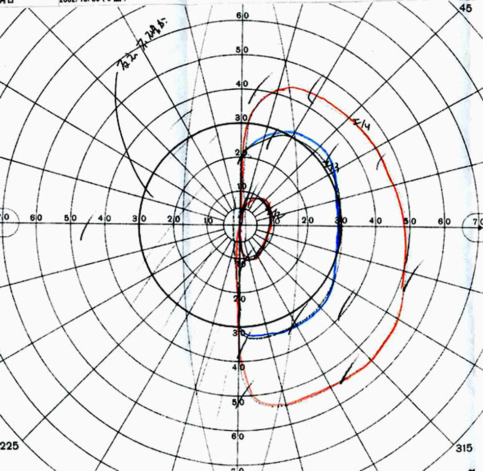 2歳のとき右眼の失明で発症し化学療法が継続されました。これは8歳の時の視野検査です。数ヶ月の経過で左眼も耳側半盲となりました。手術前の視野検査で,この腫瘍が右視神経から発生し,左眼は腫瘍に侵されず,たんに圧迫を受けていることがわかります。ですから,単視神経膠腫です。