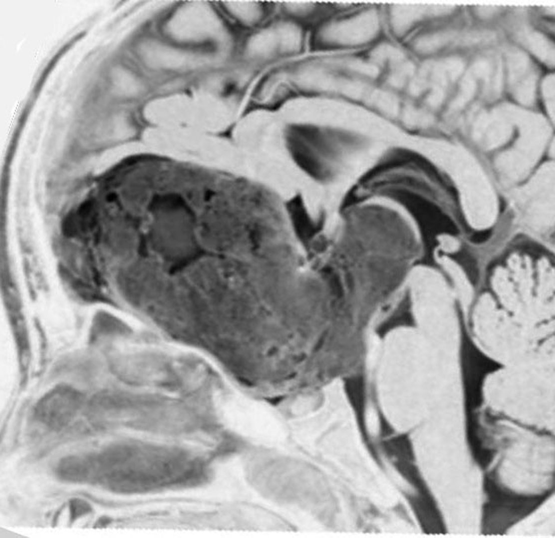 頭蓋内でしばしば巨大な腫瘍となり視交叉に少し入ります