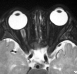 塊としての腫瘍が目立たないのに,両側視神経から視交差、視索,外側膝状体,内包後脚,視放線,視床下部,視床などに浸潤するもので,化学療法だけが治療手段です