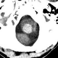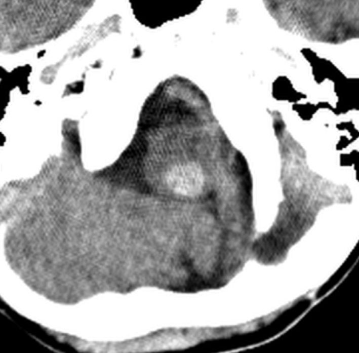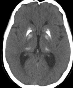CTで,両側の大脳基底核(被殻と淡蒼球)と視床後部に石灰化がみられます。乳幼児期に放射線治療を受けた子どもに見られるものです。