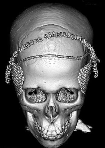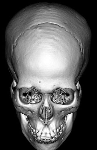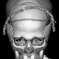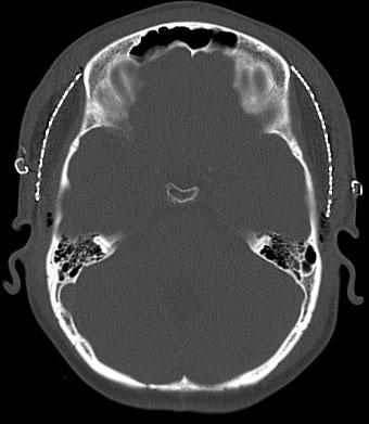 2歳くらいで全脳照射を受けた子どもが15歳になりました。前頭骨だけの発育が悪くて額の間がとても狭くて,コメカミの凹みが目立つようになりました。両側の側頭部にチタンプレートを入れて額を広くして頭蓋形成をして,見栄えはとても良くなりました。このような手術を整容的頭蓋形成術といいます。