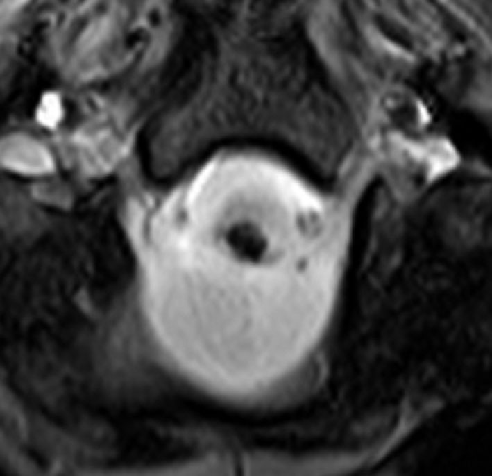 7年後のMRIです。延髄脊髄移行部(おそらくC1)に出血痕が残っています。放射線誘発海綿状血管腫といわれるものの画像所見ですが,ほんとのところは静脈閉塞によるうっ血症状と鬱血性の出血といわれています。