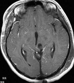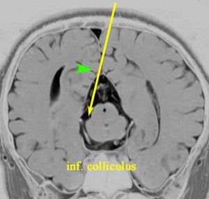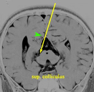 疼痛抑制系、恐れや不安、発声、性行動の制御、情動行動、心血管系、体温調節、上方注視機構などがあるとされています。中脳水道の入口部に腫瘍が食い込むことが多いので,OTAでのperiaquedactal gray matterの損傷は少なくありません。手術後に,高度の上方注視障害(パリノー現象),視床痛のような半身の疼痛,情動行動の異常による認知機能異常,体温調節障害などを生じる可能性があります。