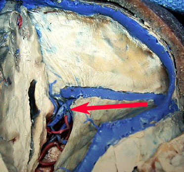 テント内部には直静脈洞と横静脈洞に続く硬膜静脈とdural sinus lakeがあります。テント切開でもっともやっかいなものです。真っ青に見える大きなlakeは切開するとすごく出血しますから避けられれば避けます。でもそこを切らないとテント切断が十分できない時には,勇気をもって切断します。
