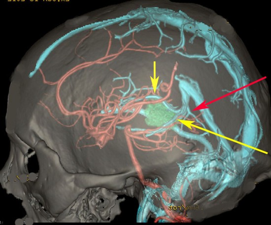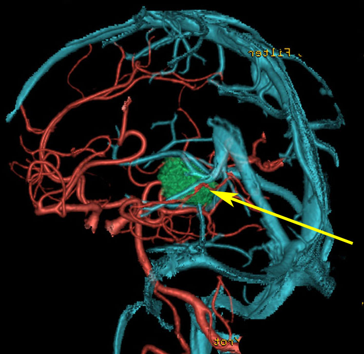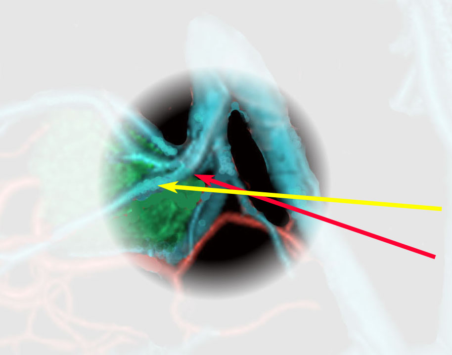 OTAでこの奇形腫を見ようとする場合に,テントを静脈洞交会の低い位置まで切断しなければ,直静脈洞の横から松果体部をみることはできません。また,黄色の矢印の方向に視野が入るので,まず最初に邪魔になるのは小脳上極です。上小脳層を左右ともに十分剥離すると,小脳が可動化して,その向こうに,precentral cerebellar veinが見えます。このveinをガレン大静脈への流入部から小脳前面に沿って剥離していくと,小脳上極がさらに可動化して松果体への視野が開ます。