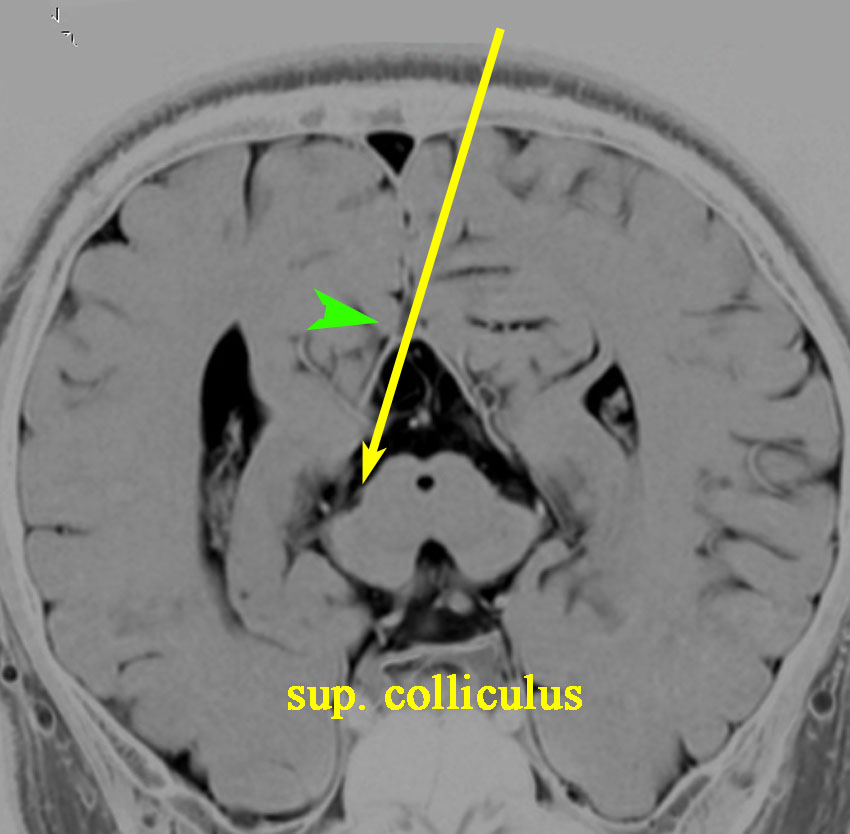 松果体腫瘍の手術では,中脳背面を見る必要があります。特に上丘とそれに連続する後交連 posterior commissureを十分に観察するために周囲組織の剥離を行います。具体的には迂回槽と下丘の周囲のクモ膜組織を剥離します。対側中脳と迂回槽を見る時に妨げになるのが,緑の矢印で示した直静脈洞です。テントが長く切断してあって直静脈洞が大脳鎌と一緒に動かせると対側を見るのがとても簡単になります。