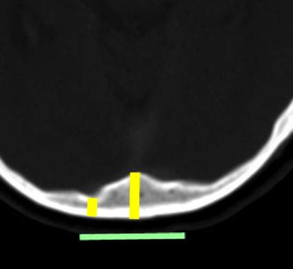 ビデオに見せているように下方から除いて横にドリルを動かしながら削除するのが効率的です。正中は内後頭隆起のためにとても深く厚い骨削除(黄色の線)となります。しかし,左右外側方向は後頭葉後頭極がありますので頭蓋骨が相対的に薄く硬膜がすぐにでます。両側の後頭極硬膜を確認しておいてから,内後頭隆起の深い骨稜を削除することが安全です。後頭極を覆う頭蓋骨の厚さには個人差があり,とても薄い骨の人がいますので気をつけます。緑の線の幅くらいを横に広く開けます。