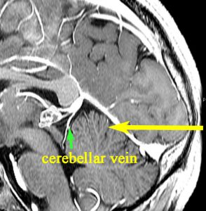 かなり太いと感じられるprecetral cerebellar veinでも,おそらく切断してもよいです。切断の方法などは,静脈切断という項目が別ページにあるので読んでみてください。ただし,上述のテント切断のところで,テント下面に流入する大きな小脳架橋静脈を切断した場合にはその限りではなく,小脳上半部の静脈還流が鬱滞して小脳腫脹を招くリスクがあります。