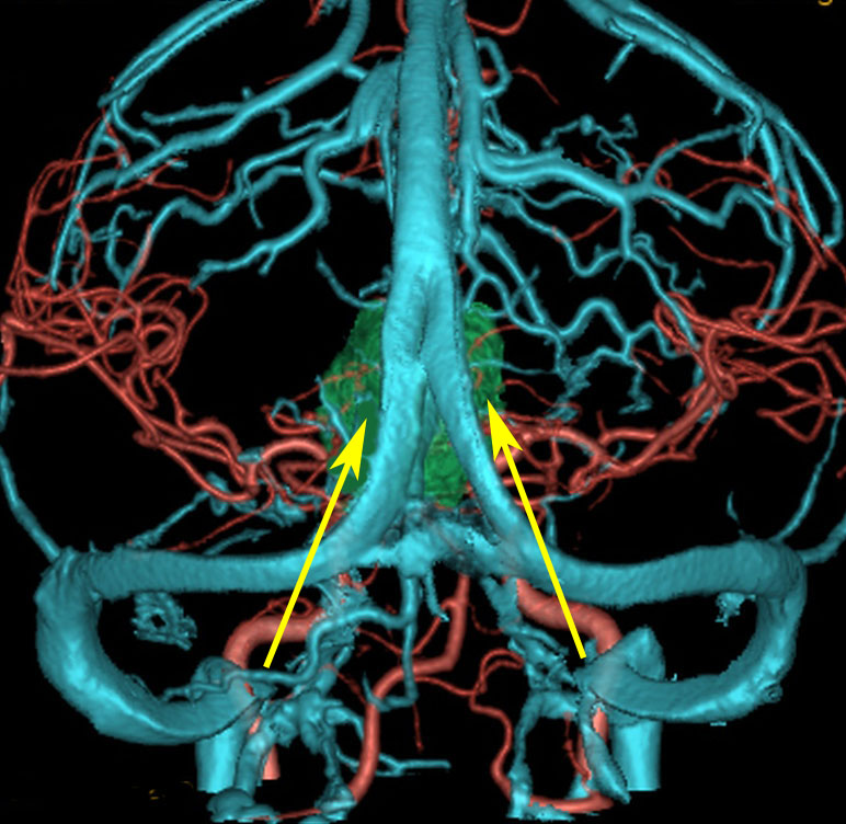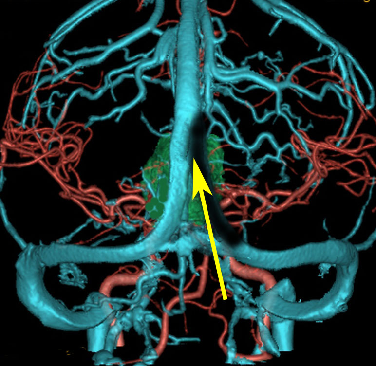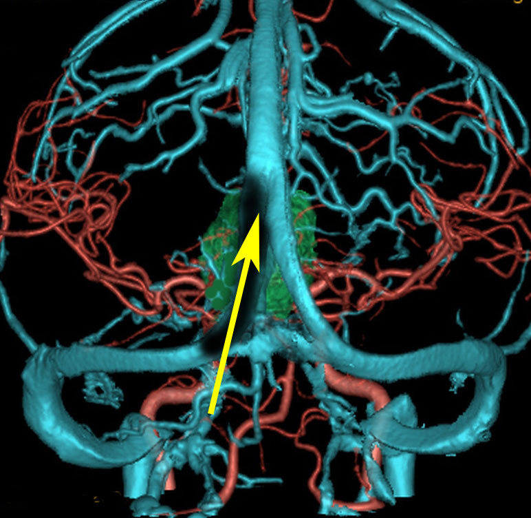 腫瘍からの導出静脈のイメージ図です。松果体腫瘍なので,松果体静脈 pieal veins(赤くぬった静脈) から導出されます,ガレン大静脈の腹側,ICVの腹側に還流します。松果体静脈の他にも第3脳室上部の静脈がICVに腫瘍静脈となって複数還流しています。