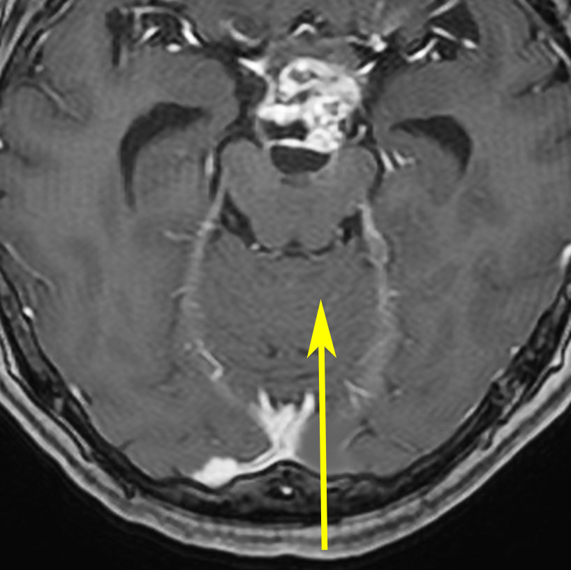 もし,このように矢状洞が左に寄っているタイプであれば,右後頭開頭をして,右の後頭極を牽引して,大脳半球間裂の右側から入った方が有利です。理解しやすいように左右反転していますので,MRIは左右逆でみてください。