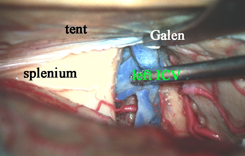 全ての手術操作を通してもっとも困難な部位であり,この部分が上手に剥離できないと,「腫瘍部分摘出」という結果になります。一方,この静脈を切断し損なったりちぎってしまうと,ICVからの大量の出血を招き,手術死亡や視床の大きな梗塞などの重篤な合併症を生じます。