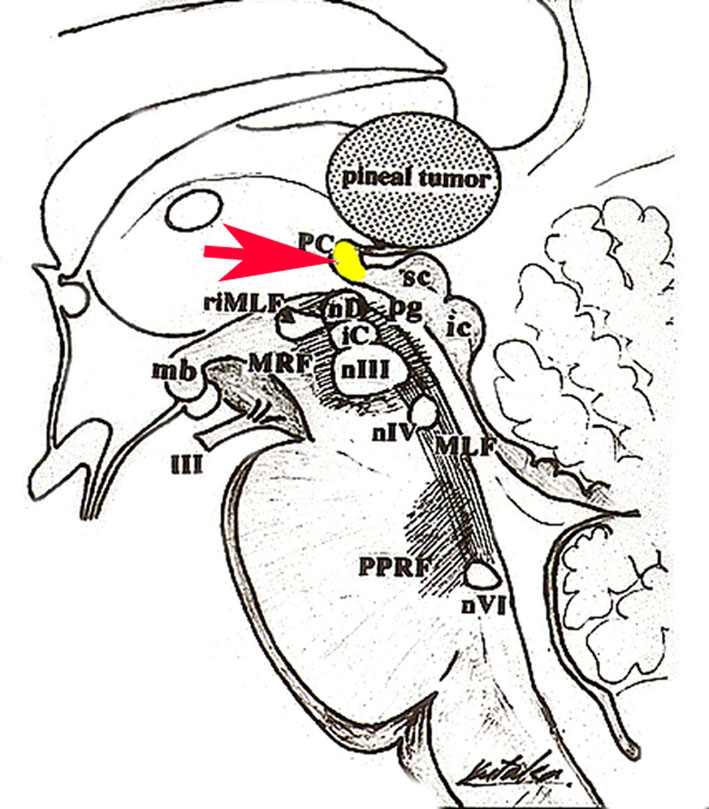 松果体腫瘍が上丘を圧迫して眼球運動障害を呈することは良く知られています。実際に松果体腫瘍の手術で上丘を損傷することはほとんどなく,術後に残る微妙な複視は,後交連 (PC posterior commissure) の損傷によって生じます。左の画像のように,松果体腫瘍が第3脳室方向に伸展増大すると後交連を圧排して,後交連は扁平化します。手術中には,上丘の奥に,上丘と連続して白く薄い脆弱な白質組織が見えます。それが後交連です。左右にも長い白質組織なので,腫瘍底面から非常に慎重に剥離する必要があります。後交連の剥離が終わると第3脳室内の髄液腔に抜けます。