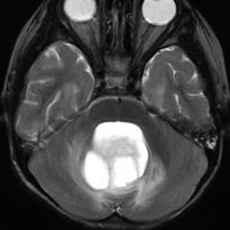手術翌日のMRIです。小脳失調症状の出現はなく,抜糸してすぐに退院して普通の生活に戻れました。