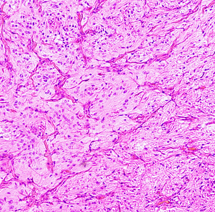 12歳の少女の小脳虫部と右半球深部白質の間にできた毛様細胞性星細胞腫 pilocytic astrocytoma です。軽い体幹失調がありました。のう胞壁の大部分には腫瘍はありませんが,一部に腫瘍壁があります。必ずしも境界は明瞭ではなく,小脳虫部の上内側面に広範囲に接着しています。年長児の毛様細胞性星細胞腫は,Rosental fiber, eosinophilic granular bodyが多く見られ,硬く,小脳脳組織に食い込み,簡単に剥離摘出できるものではありません。脳組織と切開切断するように切り落とさなければ全摘できないものです。