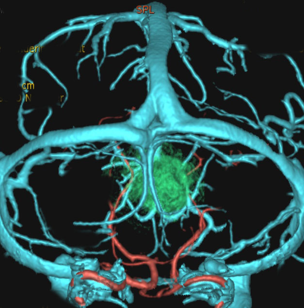 後頭下からみた腫瘍(緑)です。正中に大きな架橋静脈 vermian veinがあります。