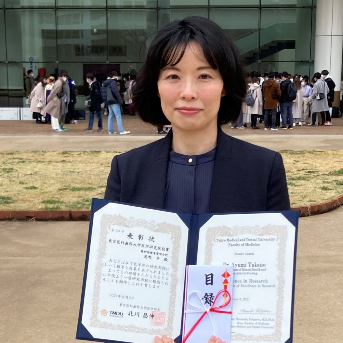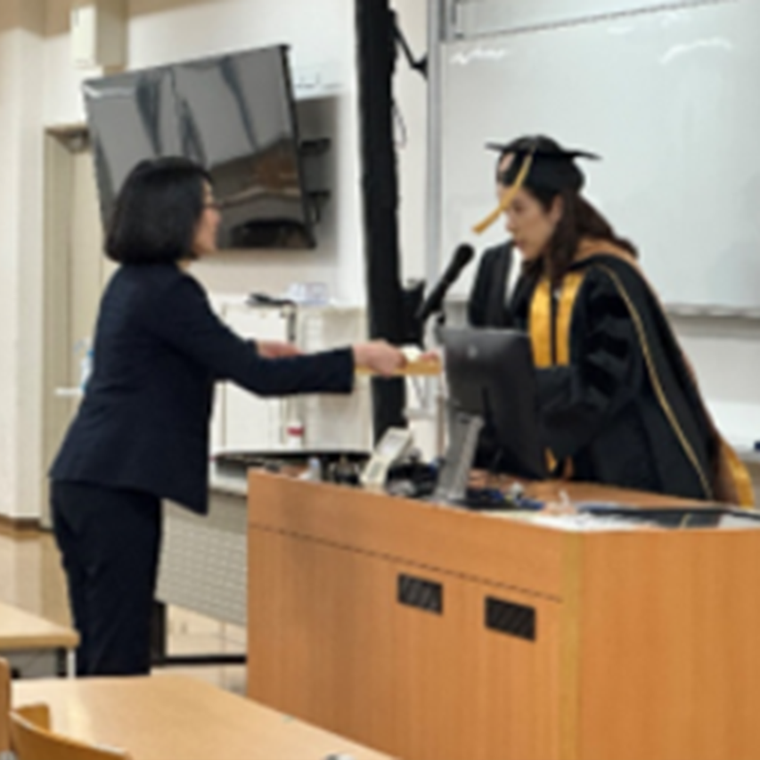 大学院学位授与式で、精神保健看護学分野院生の平岩さんに学位が授与されました。