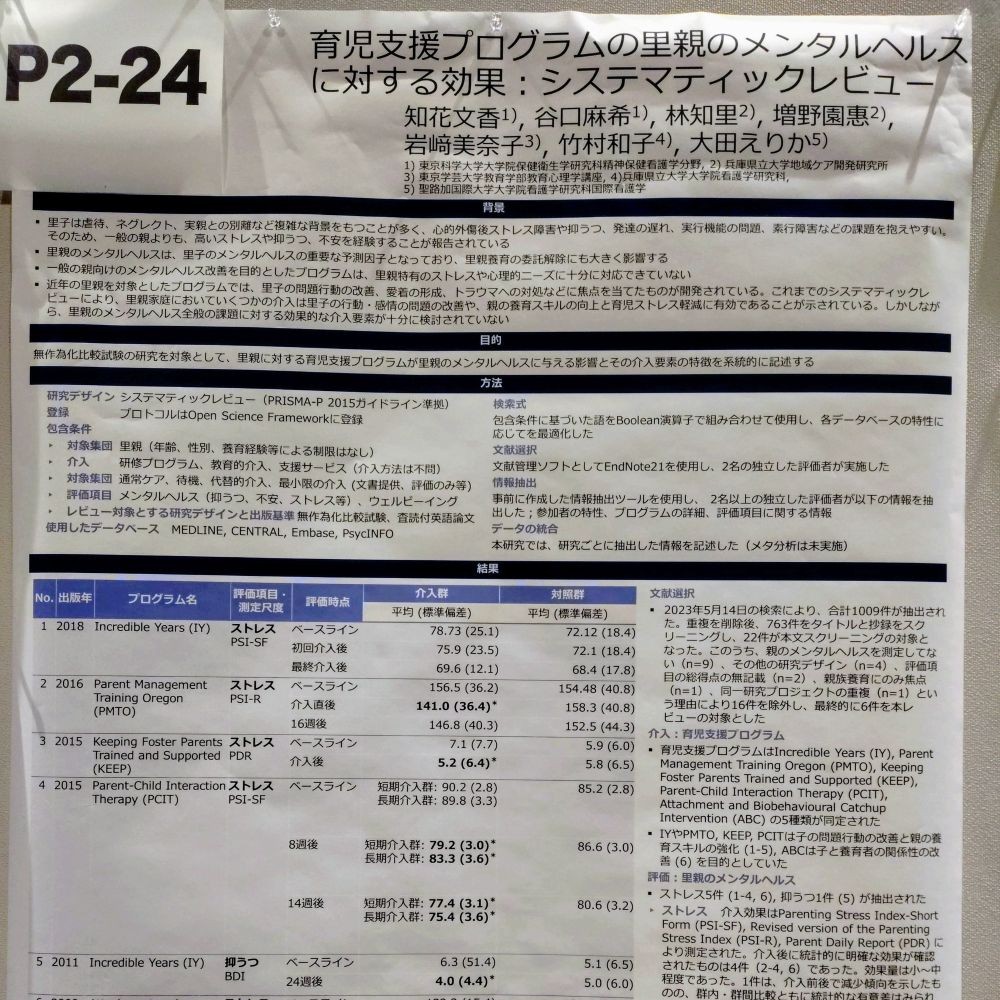 大学院生の知花さんが第43回日本社会精神医学会学術大会にてポスター発表「育児支援プログラムの里親のメンタルヘルスに対する効果:システマティックレビュー 」を行いました。