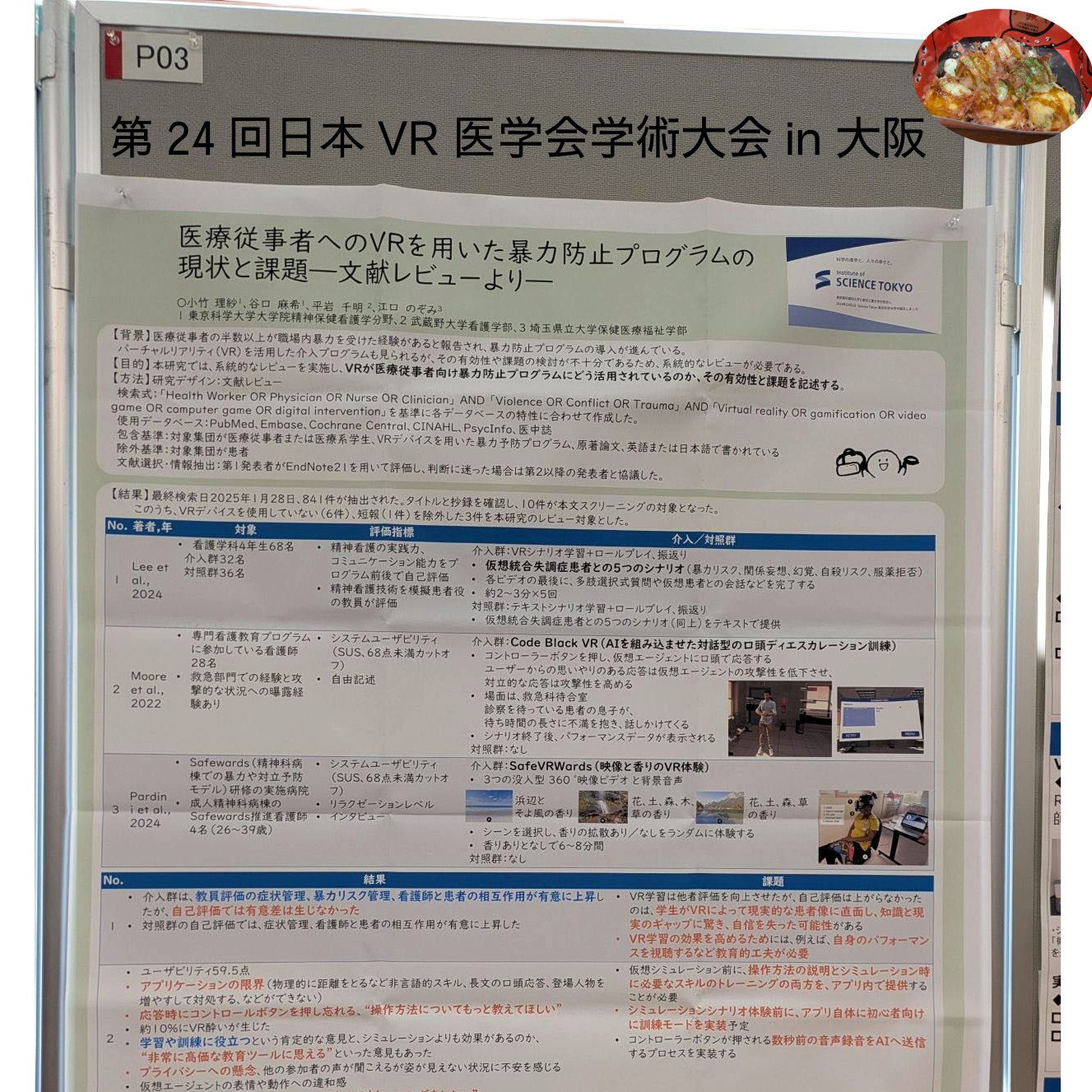 小竹理紗特任研究員が、第24回日本VR医学会学術大会にて、ポスター発表「医療従事者への VR を用いた暴力防止プログラムの現状と課題―文献レビューより―」を行いました。