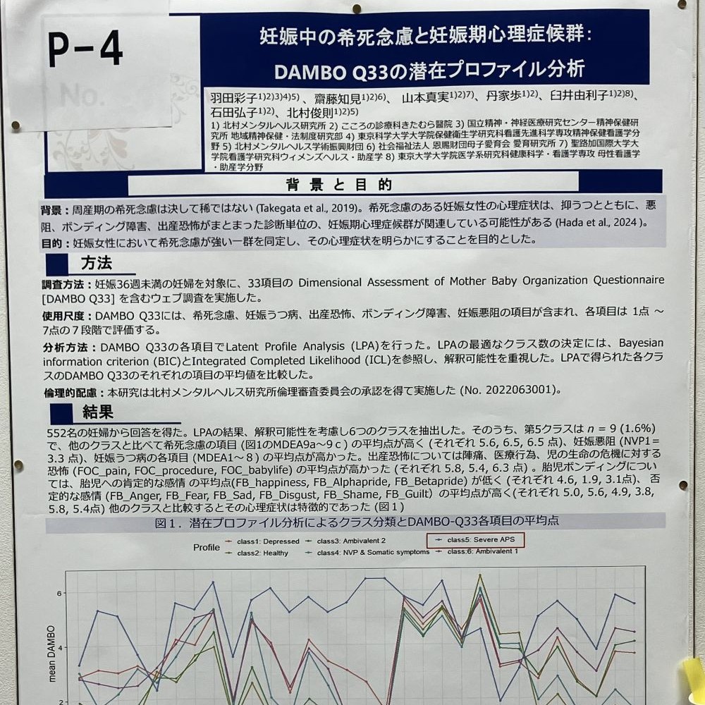 大学院生の羽田さんが第21回日本周産期メンタルヘルス学会学術集会にて、ポスター発表「妊娠中の希死念慮と妊娠期心理症候群: DAMBO Q33の潜在プロファイル分析 」を行いました。