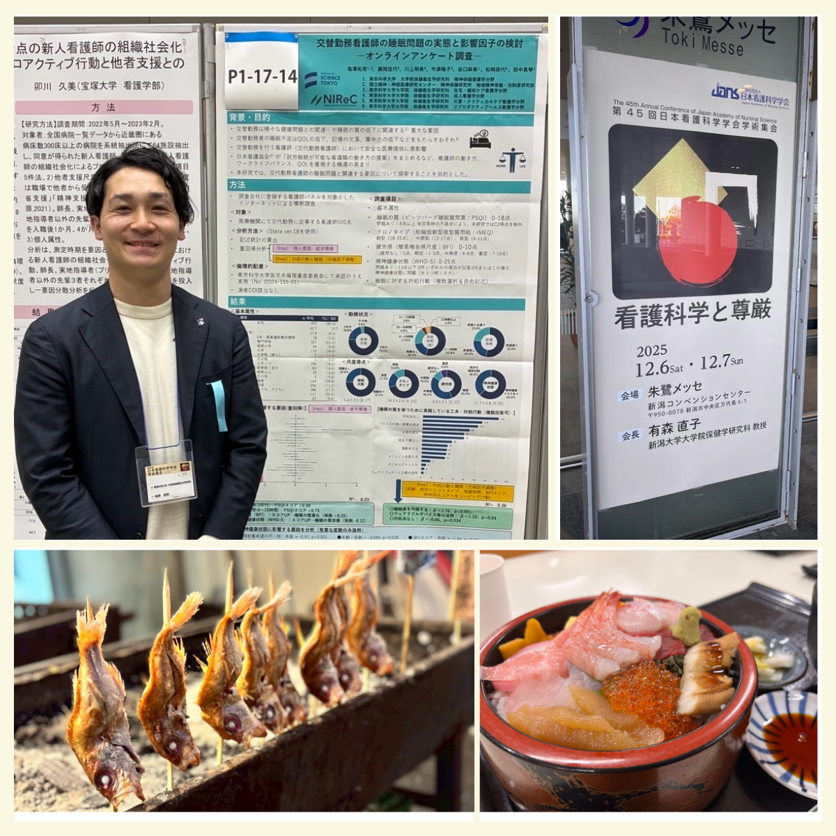 「交替勤務看護師の睡眠問題の実態と影響因子の検討―オンラインアンケート調査―」というテーマでポスター発表を行い、シフトワークという不規則な勤務形態が看護師の心身の健康に与える影響などについて、参加者の方々と意見交換をする貴重な機会を得ることができました。