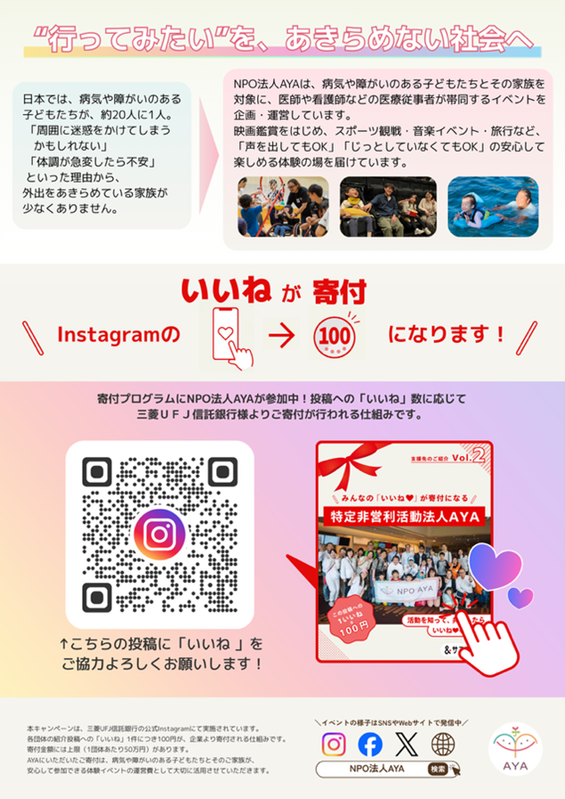 AYAさんは、医療的ケア児や神経発達症など、障害を有する子どもたちとその家族に外出・体験の機会を増やす活動を行っています。現在、活動支援のキャンペーンを実施していますので、ご関心のある方はAYAの活動をご参照ください 。