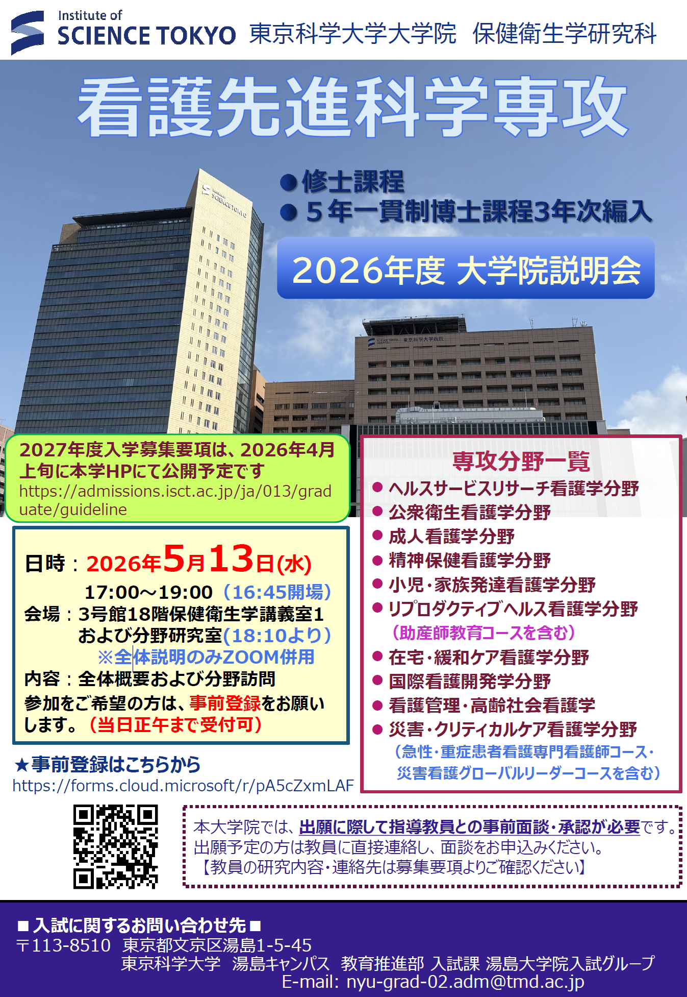 会場:湯島キャンパス医学部3号館18階保健衛生学講義室1(全体説明のみZoom併用)